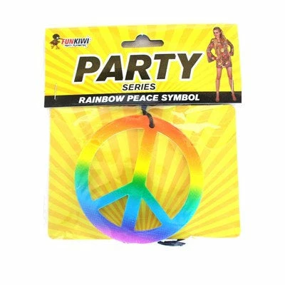 Bring peace and love to your next Hippie or 1960s themed party with this colourful Rainbow Peace Necklace. This psychedelic coloured necklace features a rainbow plastic peace sign hung on a gold string, perfect for any hippie outfit!!Â