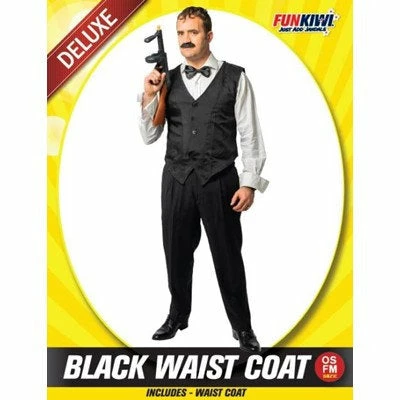 Our multi purpose men’s black Waist Coat will transform you into the popular 1920’s Gangster, Waiter to a British Toff. This waist coat is a costume starter and you can vary your costume by changing the accessories. Check out our range of hats, ties and toy guns.
