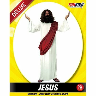 Men’s Jesus Costume includes cream robe with attached red drape. We have a variety of Jesus wigs in store to choose from to complete the look.