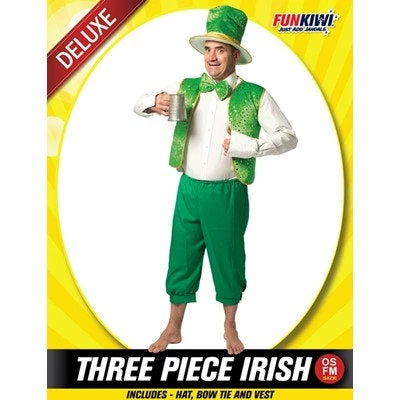 Three Piece Irish costume with gold shamrocks on the hat, vest and bow tie.