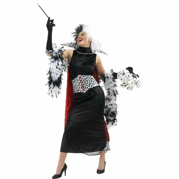 Cruella De Ville costume includes a velveteen dress, with spotted cape with red lining, spotted belt, gloves, two tone wig, boa and dalmatian handbag.