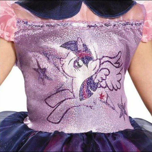 Any little girl will be guaranteed to love this My Little Pony Twilight Sparkle Deluxe Tutu Girls Costume. The costume features a beautiful dress with pink puff sleeves and a layered tulle pink and purple glitter skirt. The skirt also features a short layer of purple mesh around the waist. The bodice of the dress has a collar and an image of Twilight Sparkle, as well as a pair of detachable mesh unicorn wings at the back. To complete the look, also included is a headband with purple glitter ears and unicorn horn attached.