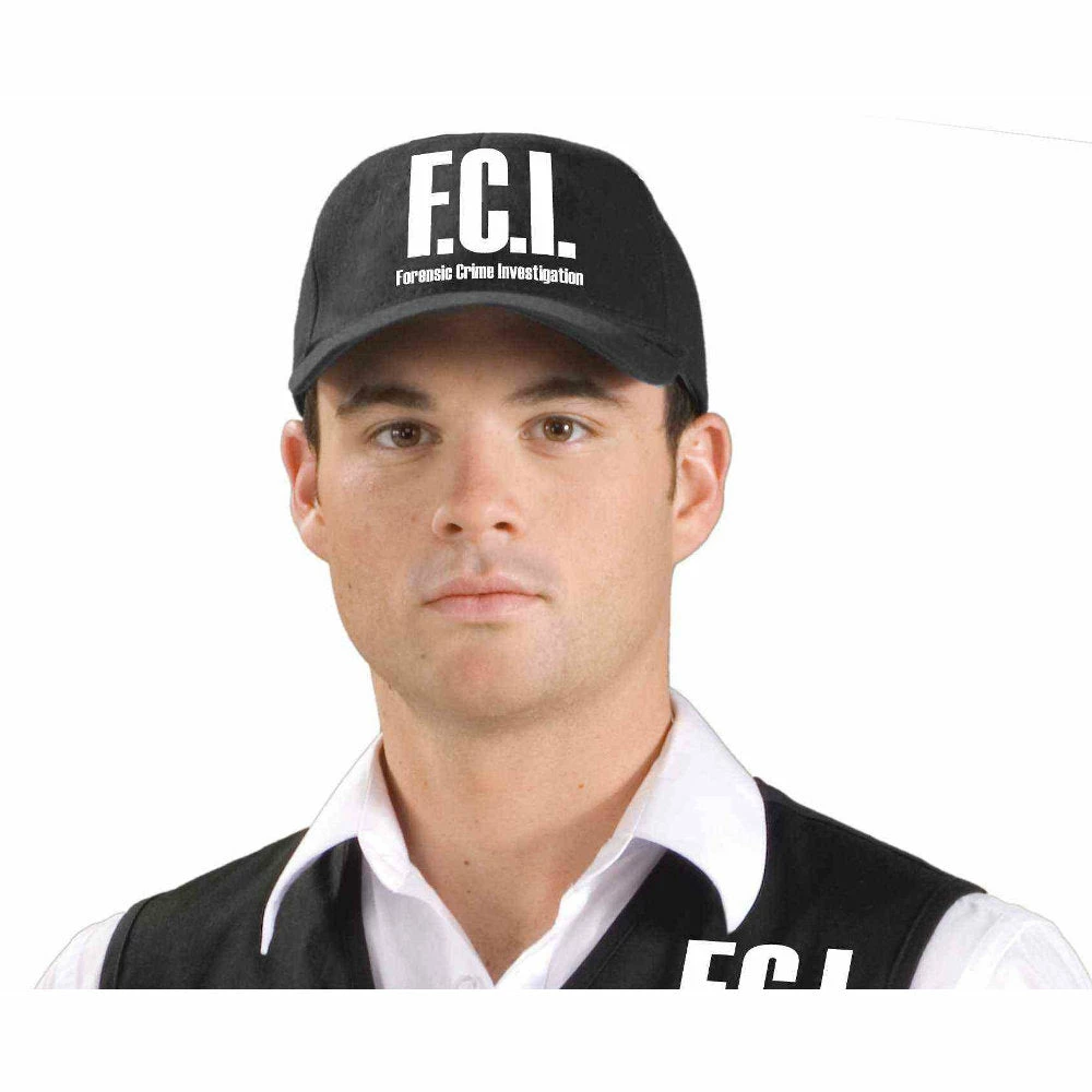 Black cap with embroidered F.C.I. text. Elastic back with hole for ponytail.