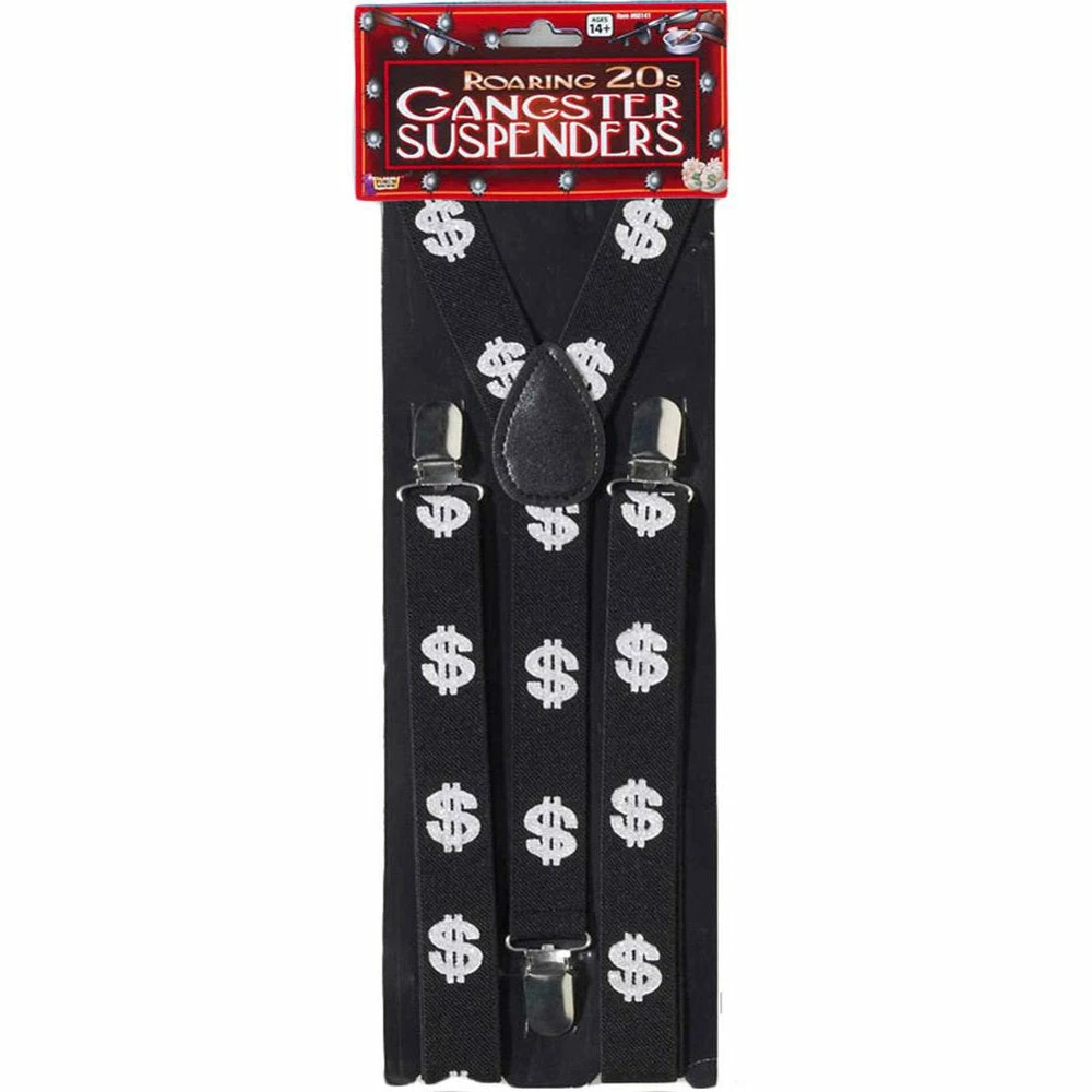 These stretchy dollar sign braces/suspenders are a great accessory for Gangster, 1920’s, Casino and Vegas costumes.