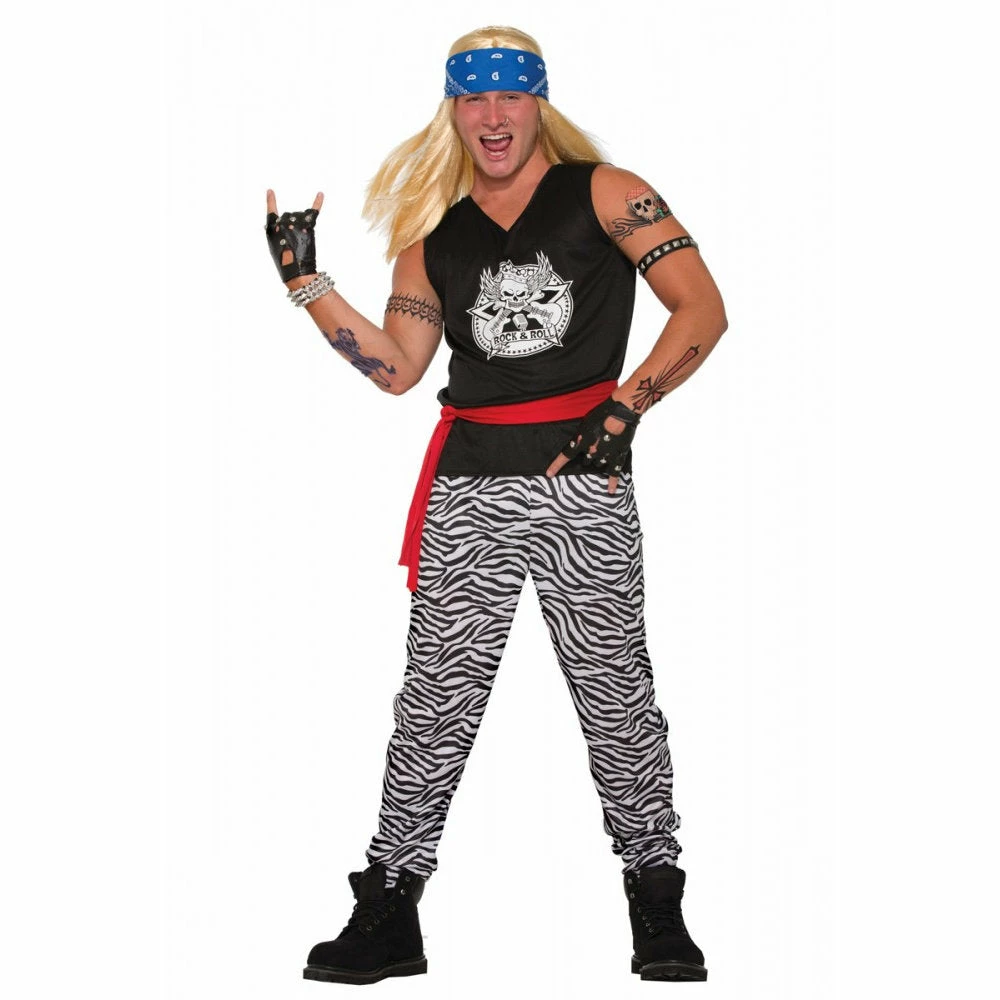 Bring back the eighties with this cool rocker costume. You’ve always wanted to be in a band and now you can look like the lead guitarist with this 80’s Rock Star costume for men. Featuring a black tank top with a rock and roll graphic print, zebra print pants, and a red sash belt, you’re sure to have a rocking good night.