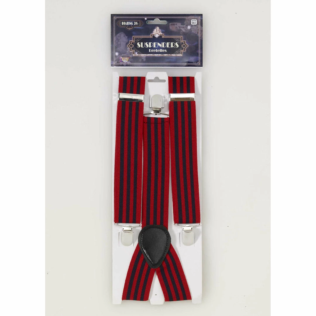 These stretchy red and blue stripe braces/suspenders are a great accessory for Gangster, 1920’s, Geek, Circus and many other costumes.