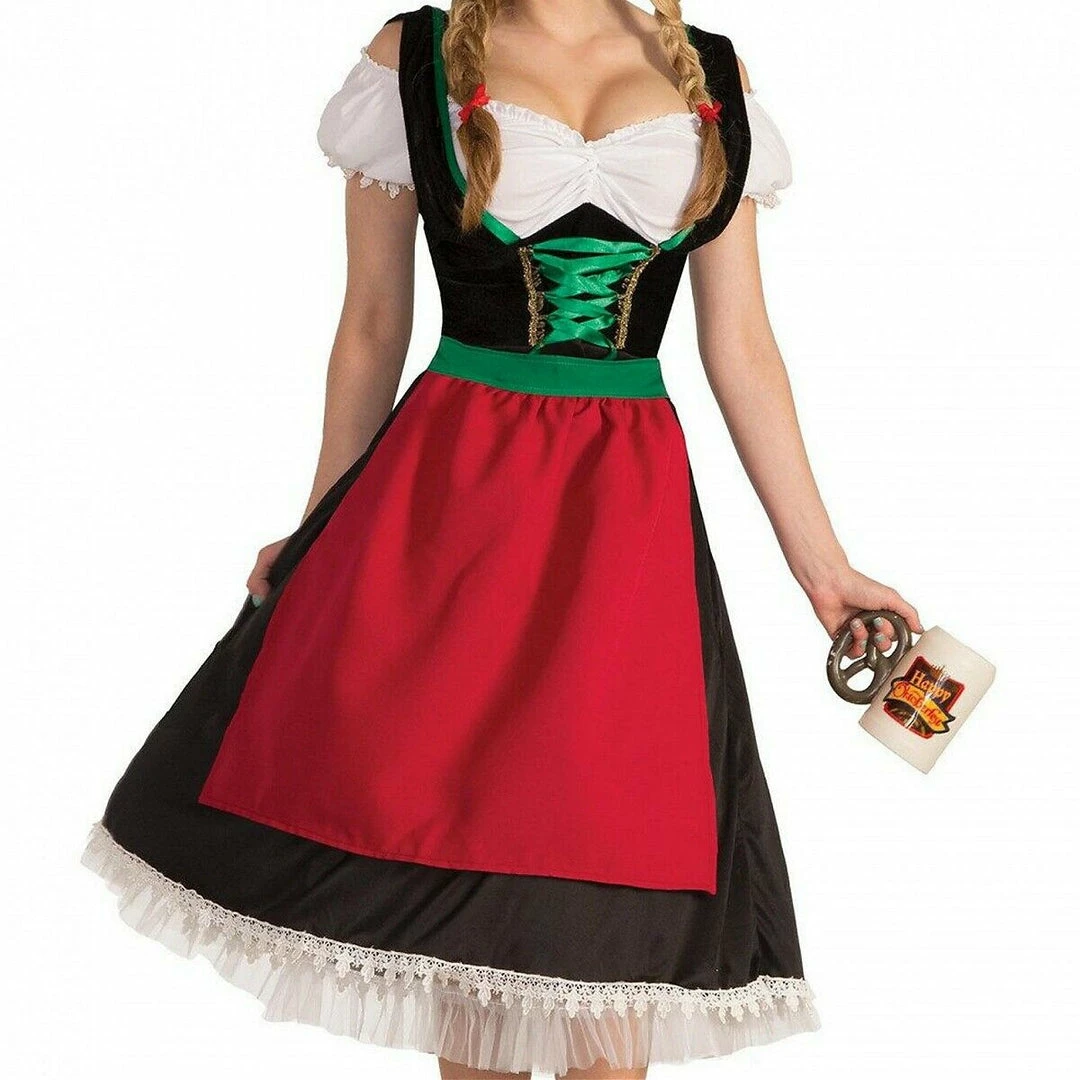 - Black dress with attached white bodice which laces with green ribbon, soft polyester skirt with lace trim. The back of the dress has elastic waist for a comfy fit.