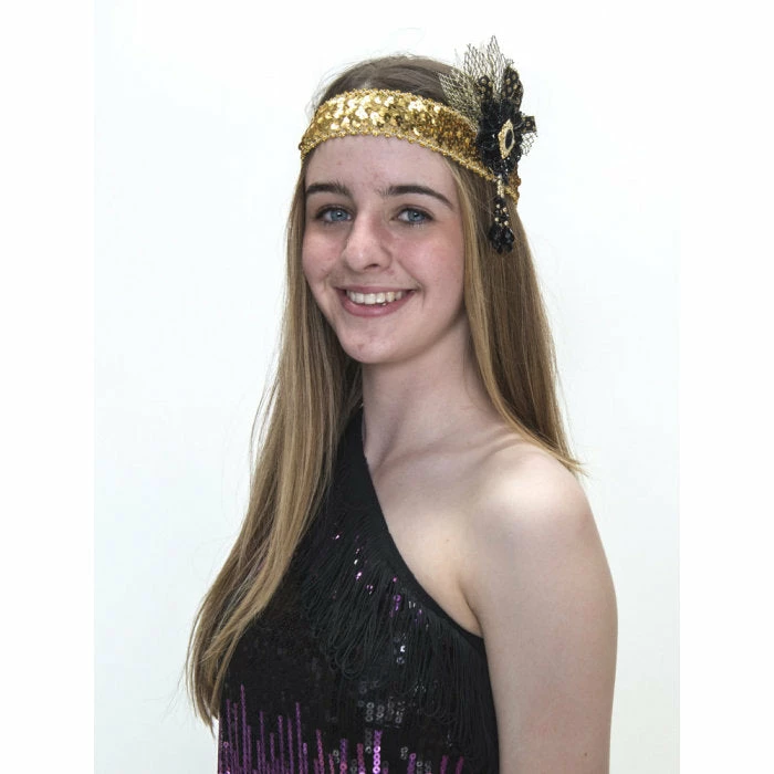 Deluxe flapper headband in black and gold with decorative brooch, ribbon and beads.