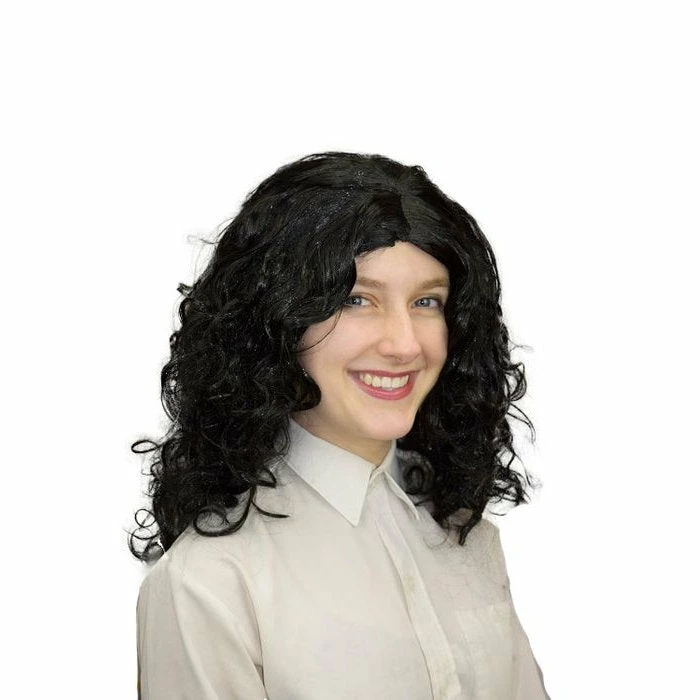 Black wavy Maid Marion wig with center part.