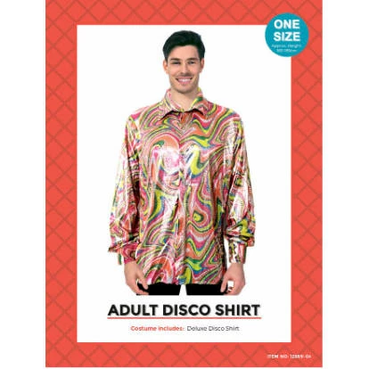 Adult 70’s Disco Shirt in Rainbow Swirl print.