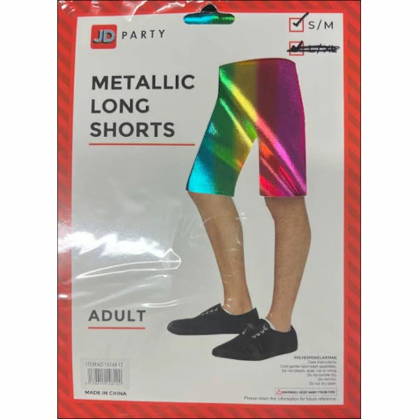 Adult Metallic Long Shorts in Rainbow are multi-purpose, wear with your, 80’s and Festival and Pride outfits.