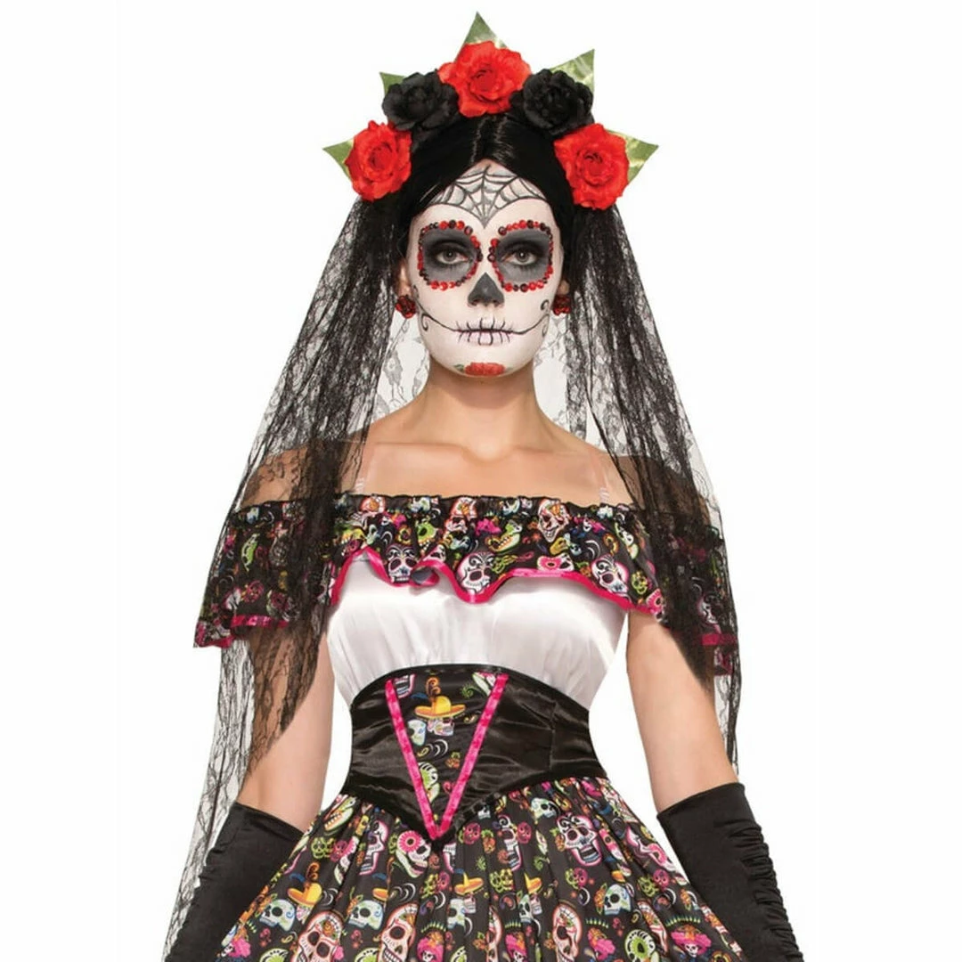- 1 Day of the Dead Black Veil with Floral Headband