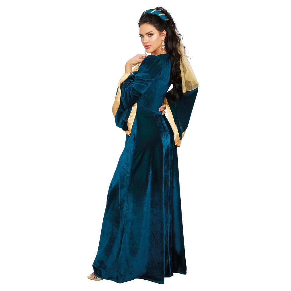 Stand out at your next medieval event with this beautiful Medieval Maiden Costume. This costume includes a velvet dress with an elaborate gold neckline and flared sleeves. Matching green and gold headpiece is also included!