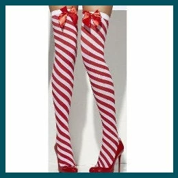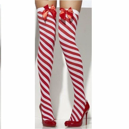 Jazz up your Christmas costume with these cute diagonal stripe Candy Cane thigh highs.