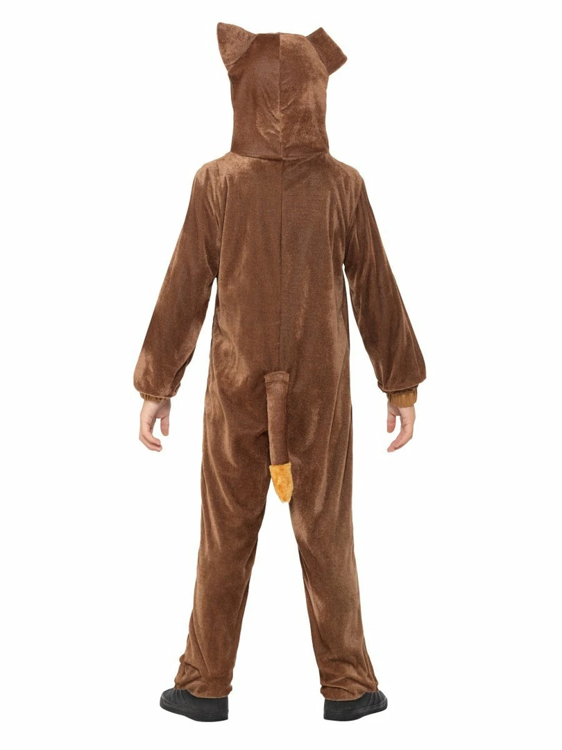 Children’s Dog costume is a soft velour jumpsuit with fur trim and attached hood featuring dog face and includes dog collar.