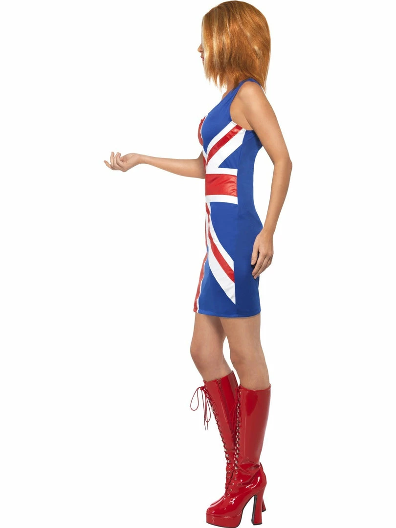 The costume is a Blue Polyester Mini Dress with the Union Jack printed on the front.