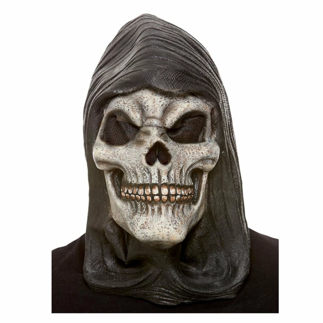 Be sure to terrify those Trick or Treaters this spooky season when you wear this nightmarish Grim Reaper Skull Mask!! This Latex Hooded Skeleton Mask features a creepy skeletal face, sunken in eyes and a full cover head hood! This classic Halloween character will in still fear in anyone!! Spooky!!