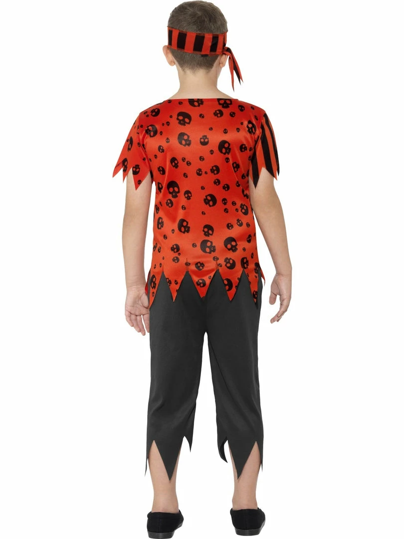 Fun and affordable Boys Jolly Roger Pirate costume includes black and red pirate top, brown pants with jagged hemline and headband.