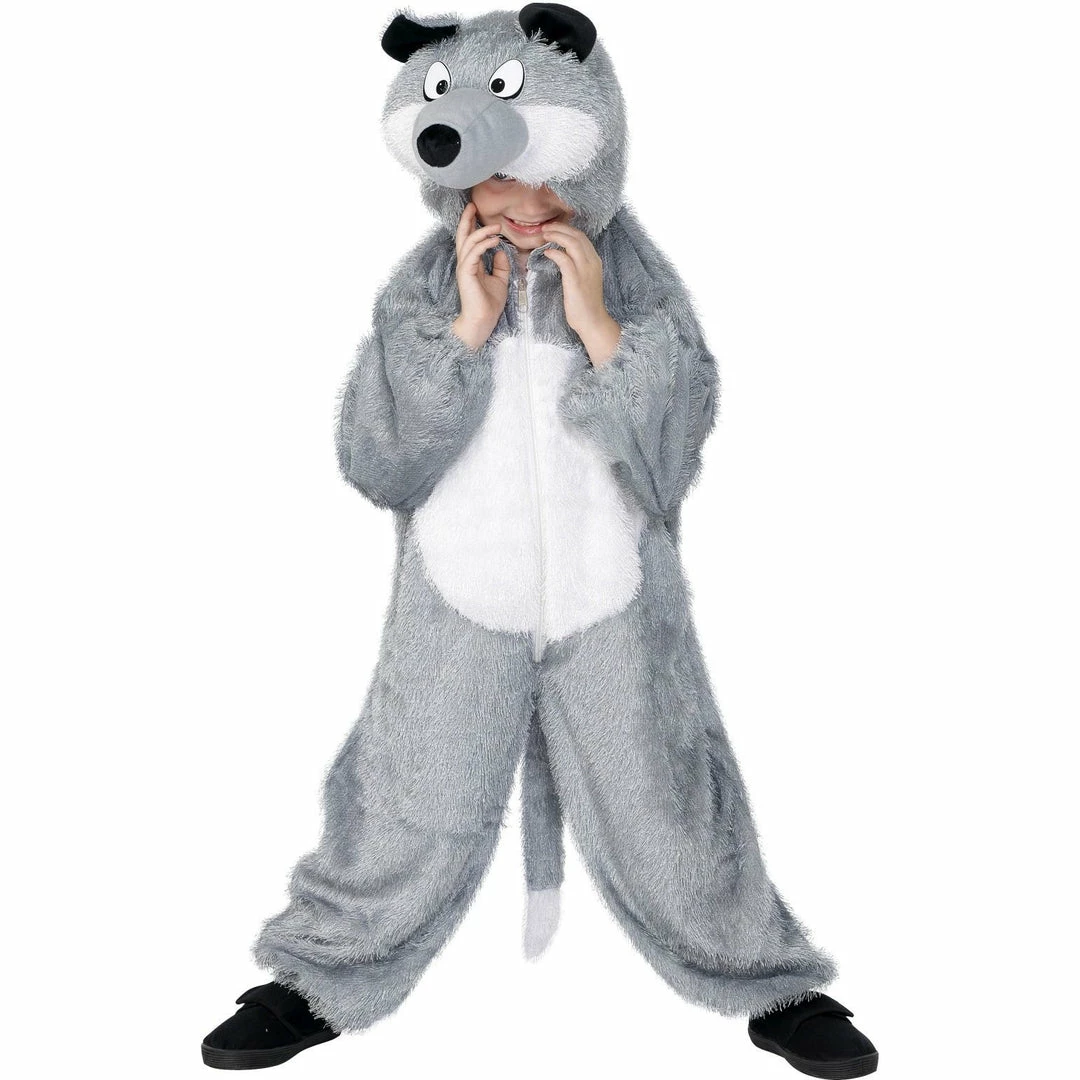 Scare off them silly little pink pigs with this brilliant all-in-one kids unisex grey and white wolf fancy dress costume which has a tail, white stomach and hood with the face and ears of a wolf on top. There is also a zip down the front for ease.
