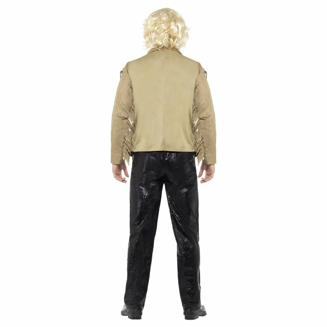 Hansel costume features a fringe mock suede jacket, mock shirt, black trousers with a snakeskin print and blue bead necklace.Â