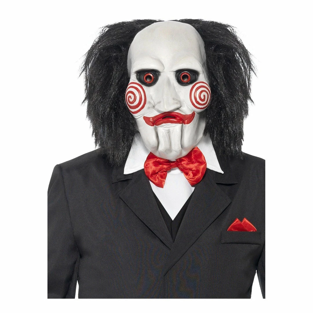Deluxe latex Saw Jigsaw Mask with attached hair, from the Horror Movies franchise, wear with a black suit and red bow tie to complete your Halloween costume.