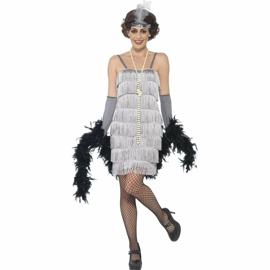 Razzle Dazzle them with this short silver fringed flapper dress. Also includes headpiece and gloves.