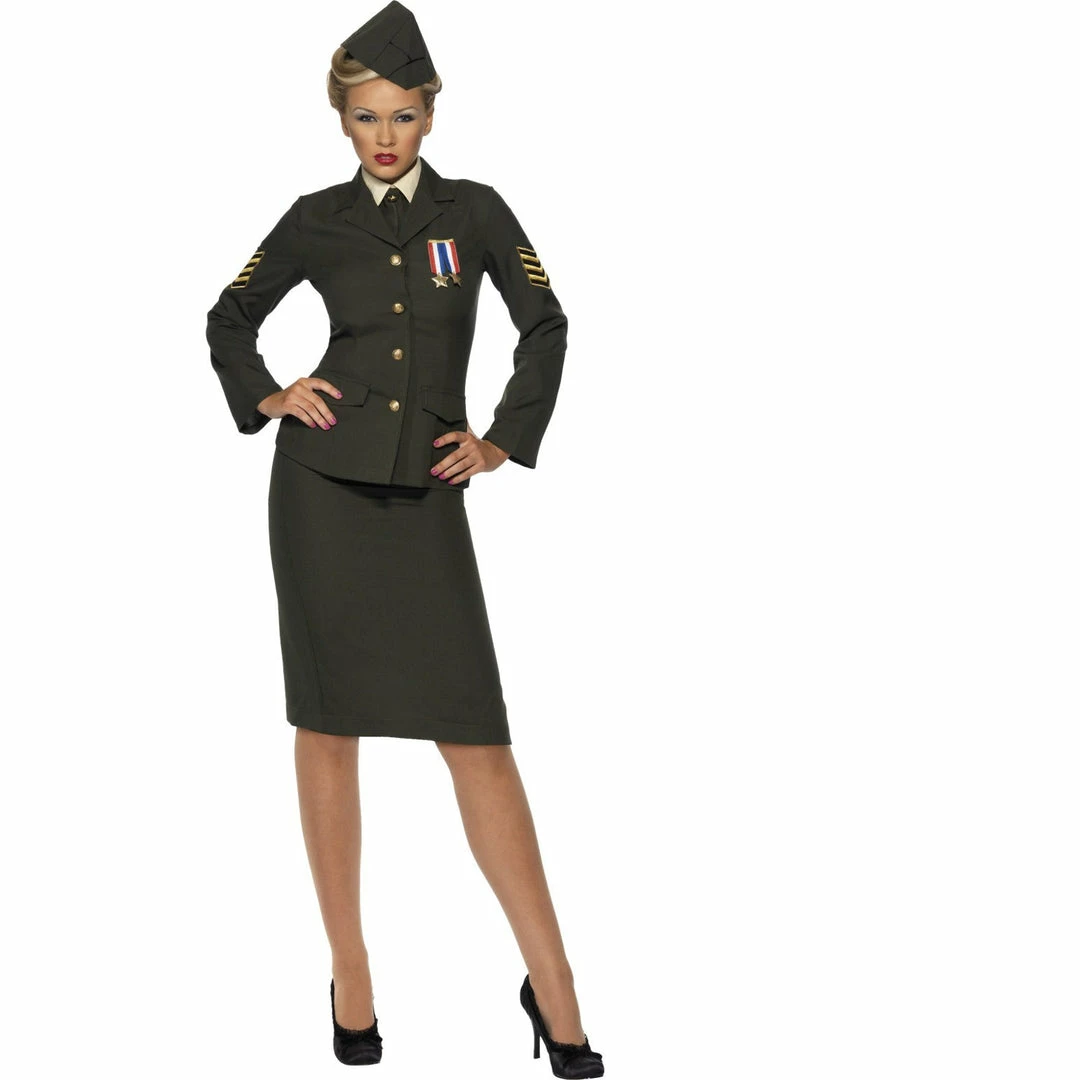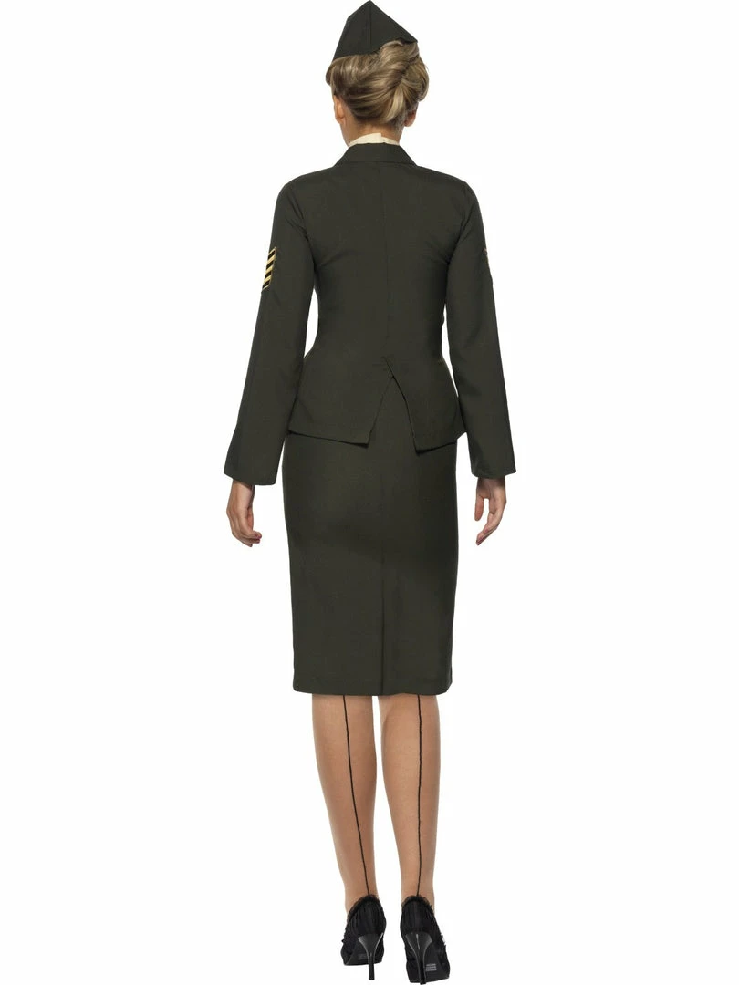 Wartime Officer costume includes: Jacket, skirt, Mock Shirt with Tie and Hat.