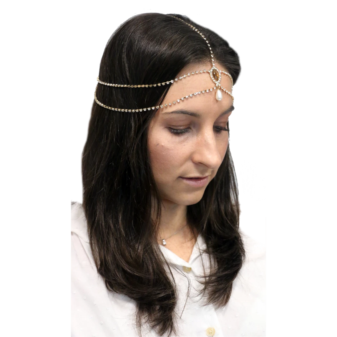 Our 1920’s Rose Gold Gatsby headband combines a delicate garnet coloured stone embellishment with a Rose Gold diamante head chain. This roaring 20’s inspired head chain commands the room. Â