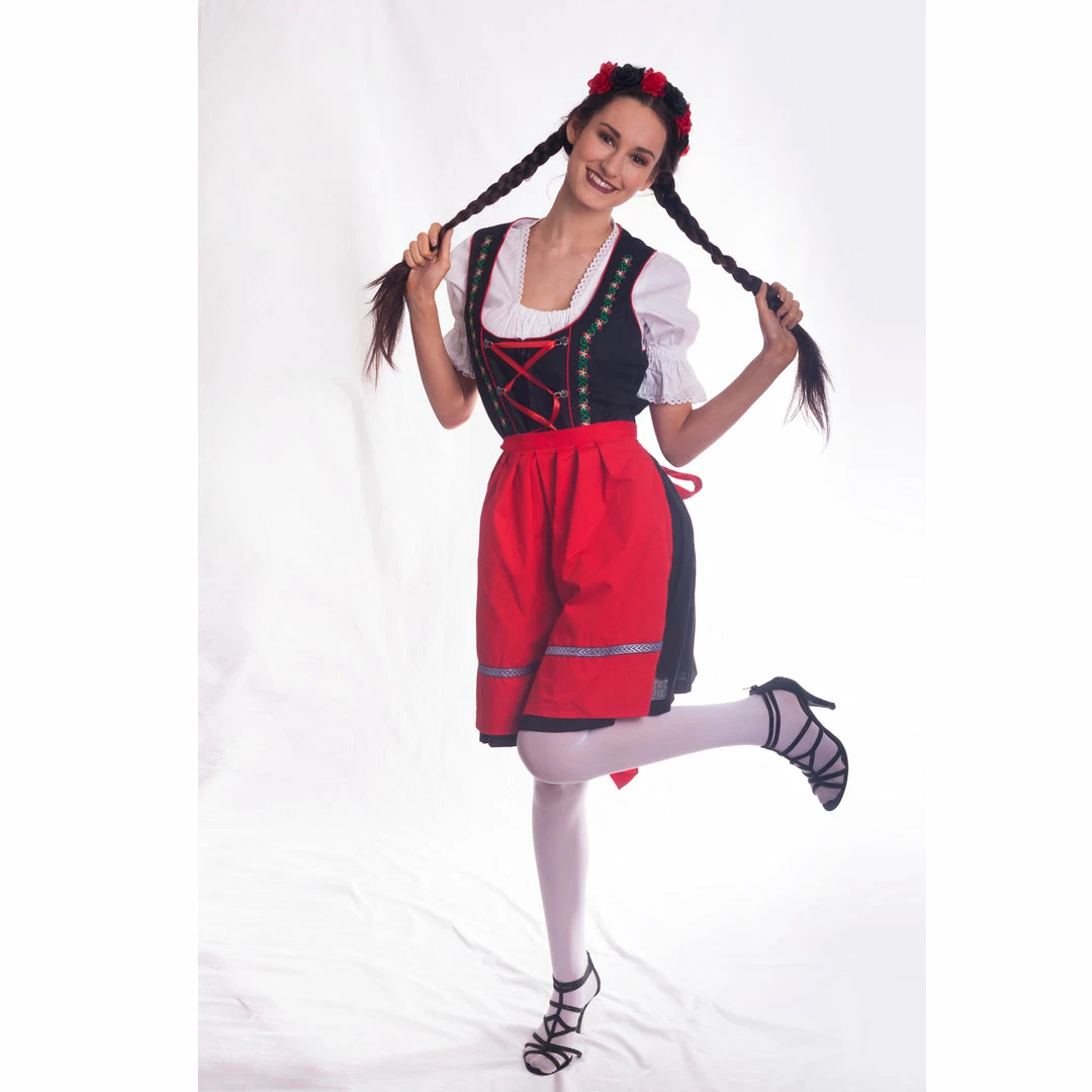 Renate, Deluxe quality black Dirndl with embroidered design on the bodice, zips up the front and laces through the bodice to get a perfect fit. Cotton cropped top with cotton lace at neckline and the bottom of the puffed sleeves. Contrasting red cotton apron with decorative trim.