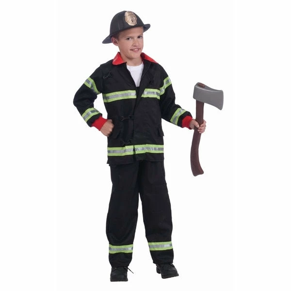 Fireman Boys Costume is the jacket and pants with neon and silver detail. The jacket also has red detail on the collar and cuffs. Costume does not include the axe or hat. Â