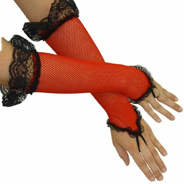 Ladies fingerless red fishnet gloves. Add a little sass to your costume, perfect for Halloween, 1920s, Showgirls and 1980s Rock Chicks.