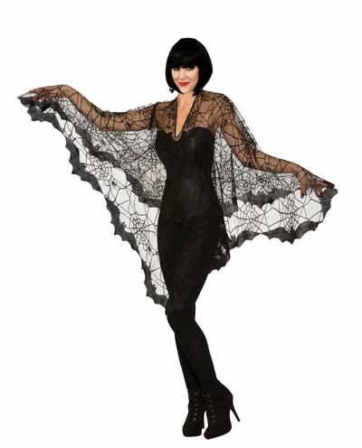 This Poncho is super cute with lace Spiderweb trimmed with bats. Glam up your own black dress with this simple Halloween accessory.