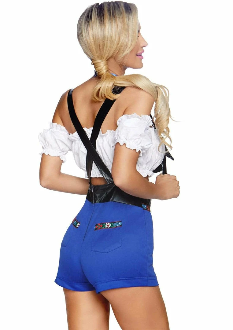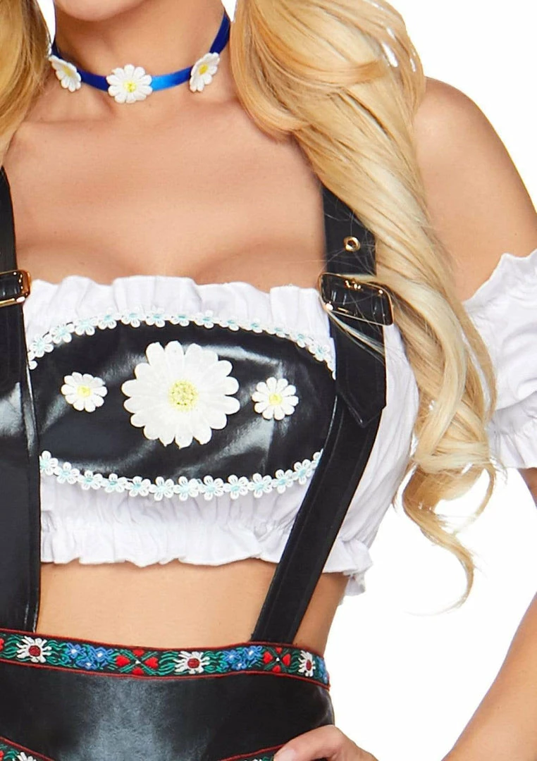 Lederhosen Honey Oktoberfest Costume by Leg Avenue. This sexy costume look includes ribbon-trimmed lederhosen with daisy bib suspenders and cropped peasant top.