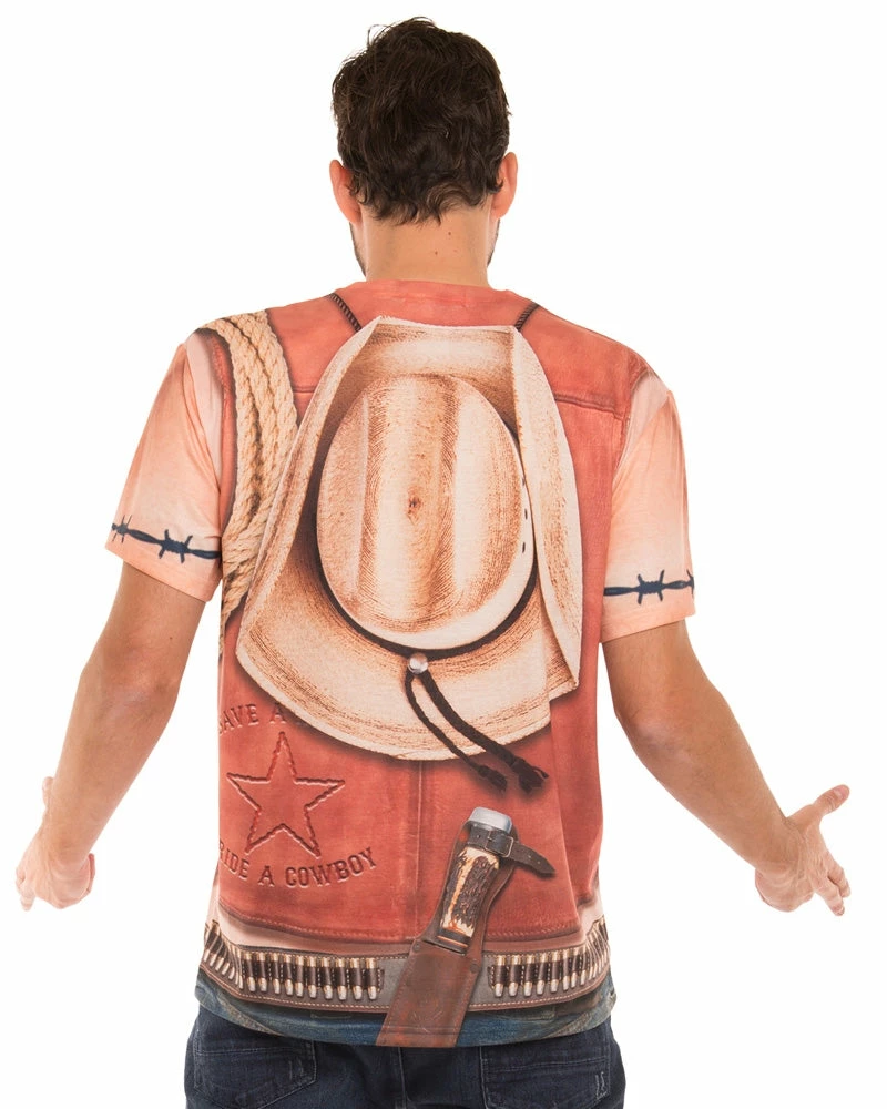 This super realistic t-shirt with a Cowboy print is sure to get a lot of second looks! Works great as an every day shirt to stand out from the crowd, or as a simple and easy costume. Live Free, Ride Free!