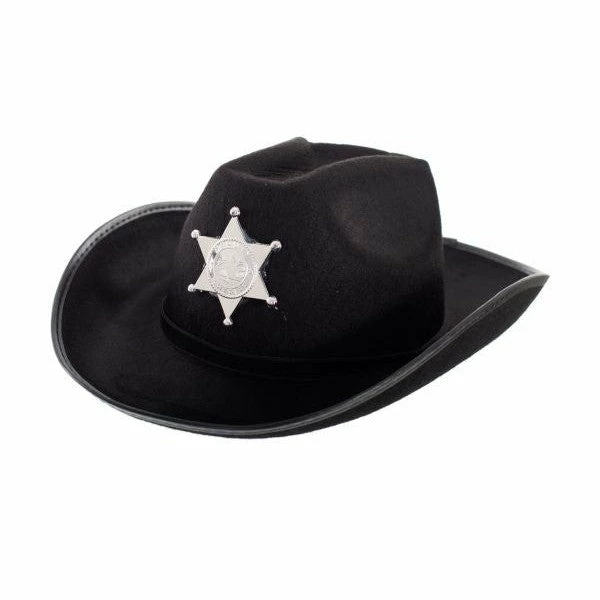 Cowboy sheriff hat in black or brown with a black band, laces for easy wear, and attached silver badge.