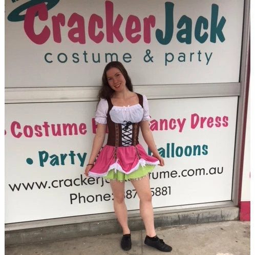 Brown, pink and green corset style Dirndl which laces through the bodice.